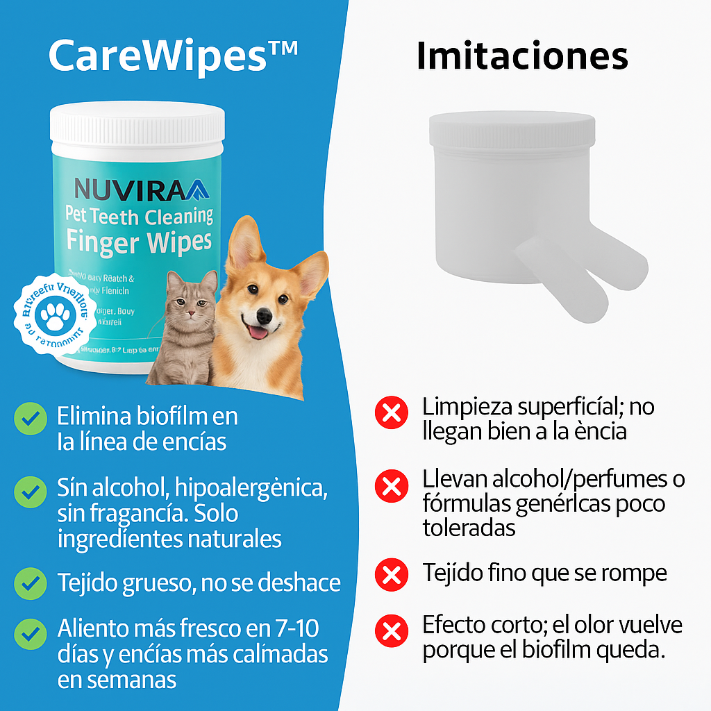 Formuladas pensando en las bocas sensibles, NuviraWipes™ son hipoalergénicas, sin alcohol ni fragancias añadidas, y con ingredientes cuidadosamente seleccionados para apoyar la salud oral de tu perro. Una solución diaria y segura que cuida de tu compañero peludo sin irritaciones.